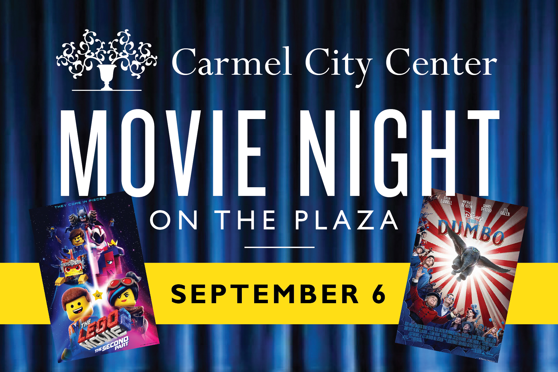 Carmel City Center is excited to Movie Nights on the Plaza on Friday, September 6. Viewers will enjoy a double feature beginning at 6 p.m. with The Lego Movie 2, followed by the 2019 version of Dumbo at 8 p.m.