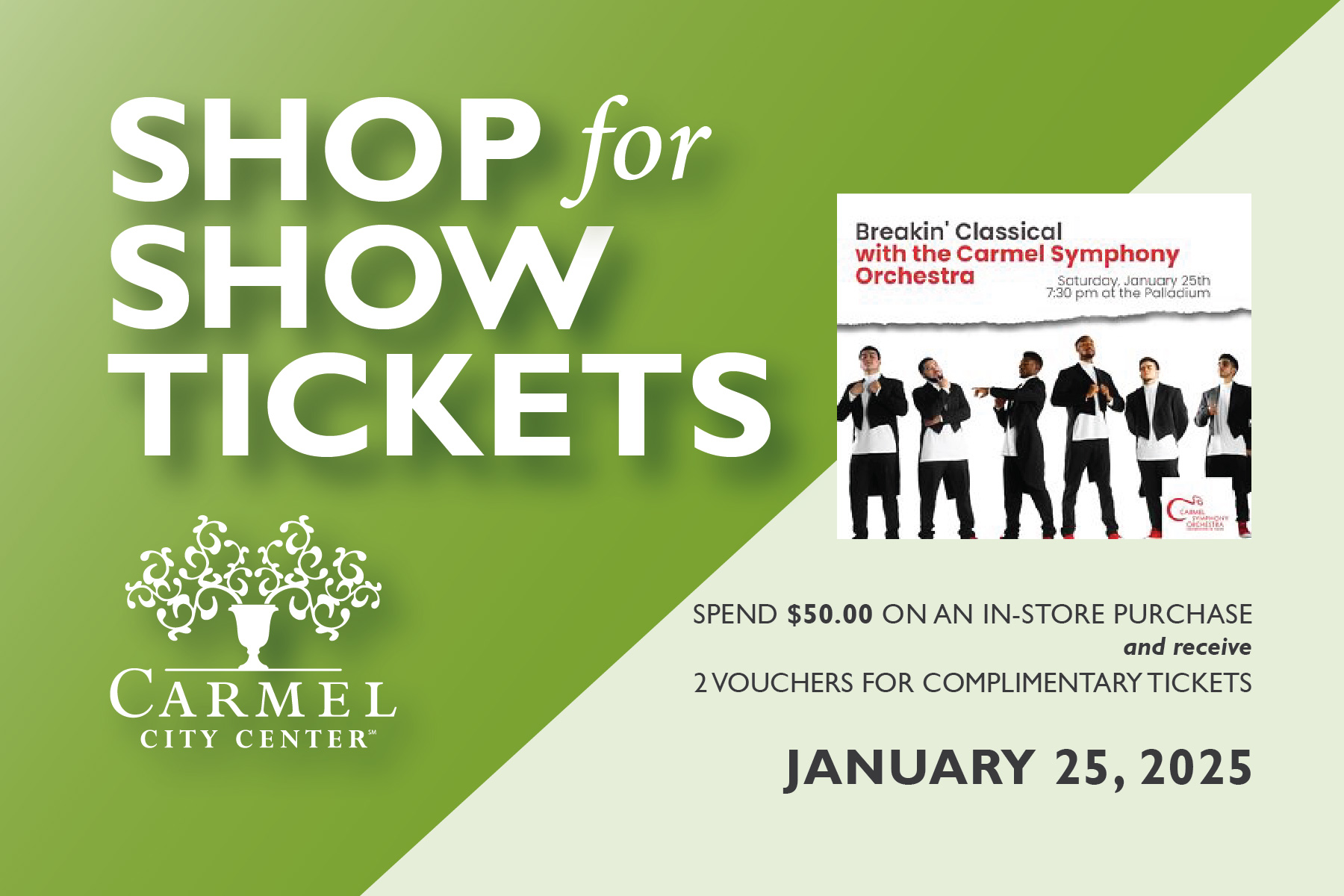 Shop and earn free tickets for BREAKIN’ CLASSICAL: A Fusion of Dance and Symphony with the Carmel Symphony Orchestra at the Palladium on Saturday, January 25th at 7:30 p.m.