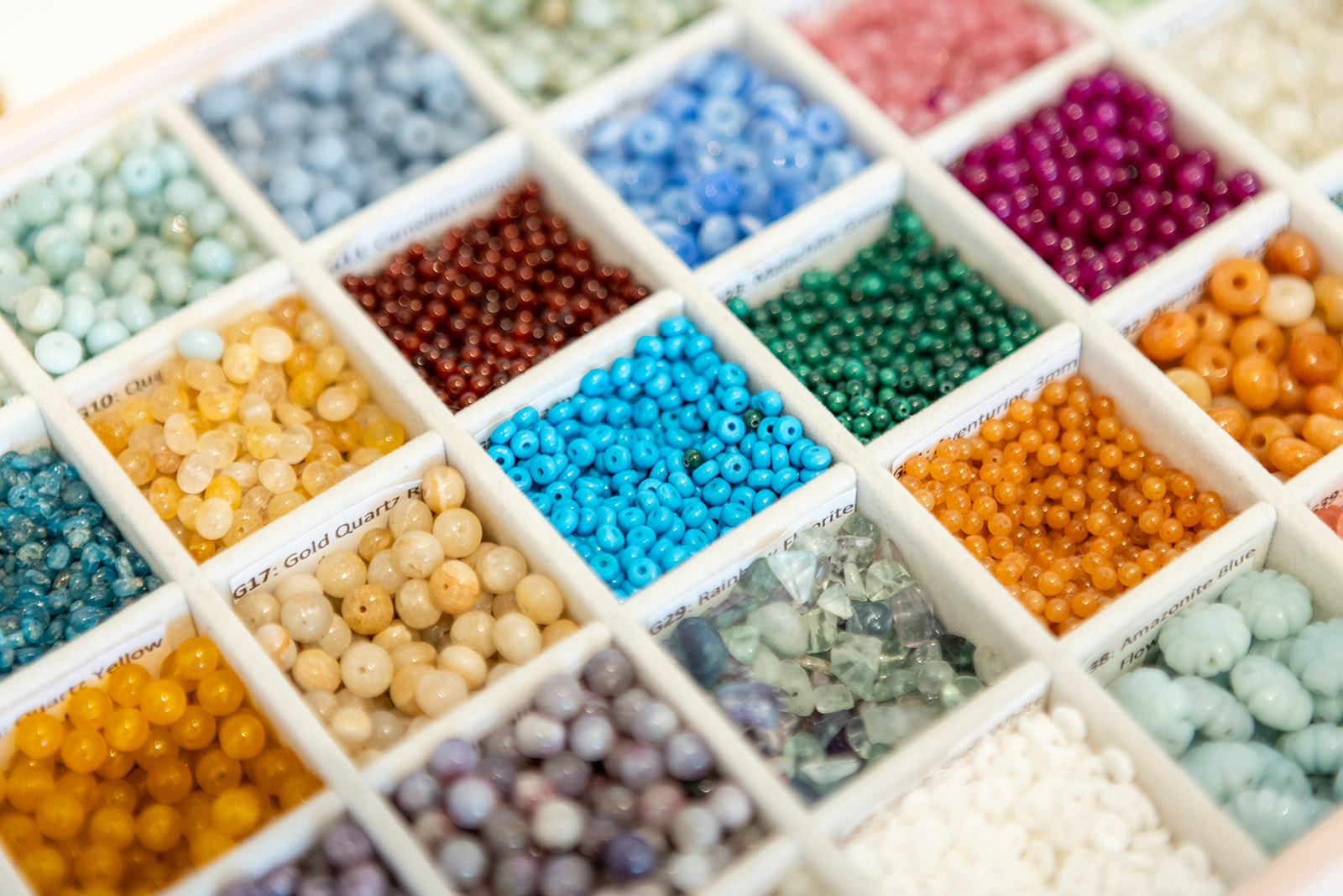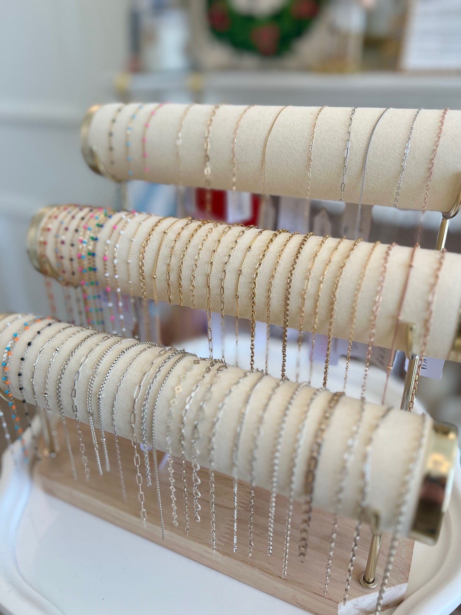 Customers are invited to make their own jewelry at the newly designed bead and charm bar. This interactive feature includes a variety of materials such as glass beads, gold-filled and sterling silver metal beads, fancy glass beads, freshwater pearls, and gemstones.