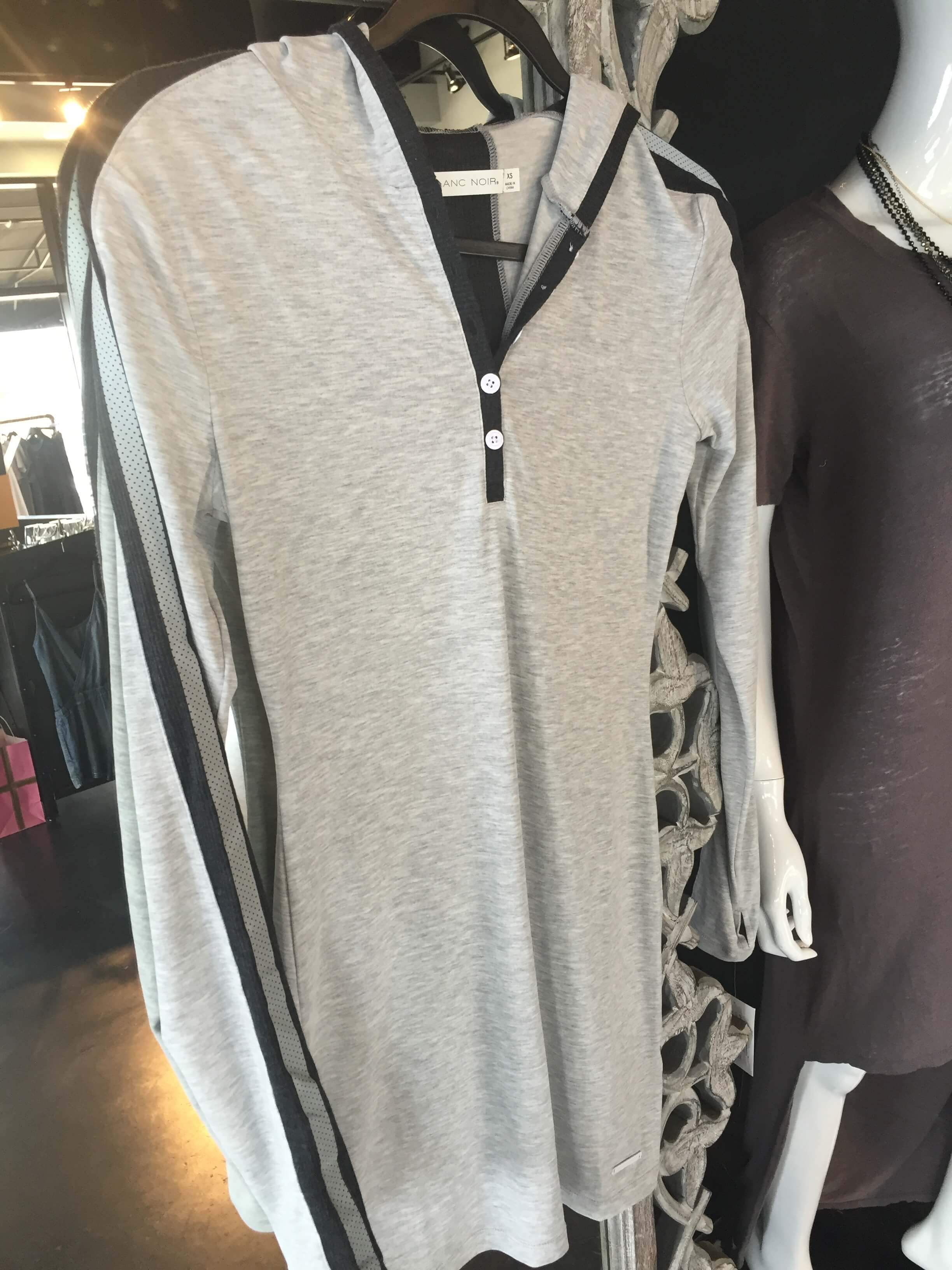 Blanc Noir hooded racer tunic with reflective trim and thumbholes take you from errands and the pool to a leisurely evening walk. Available at beauty+grace. $119