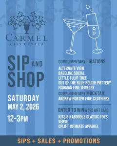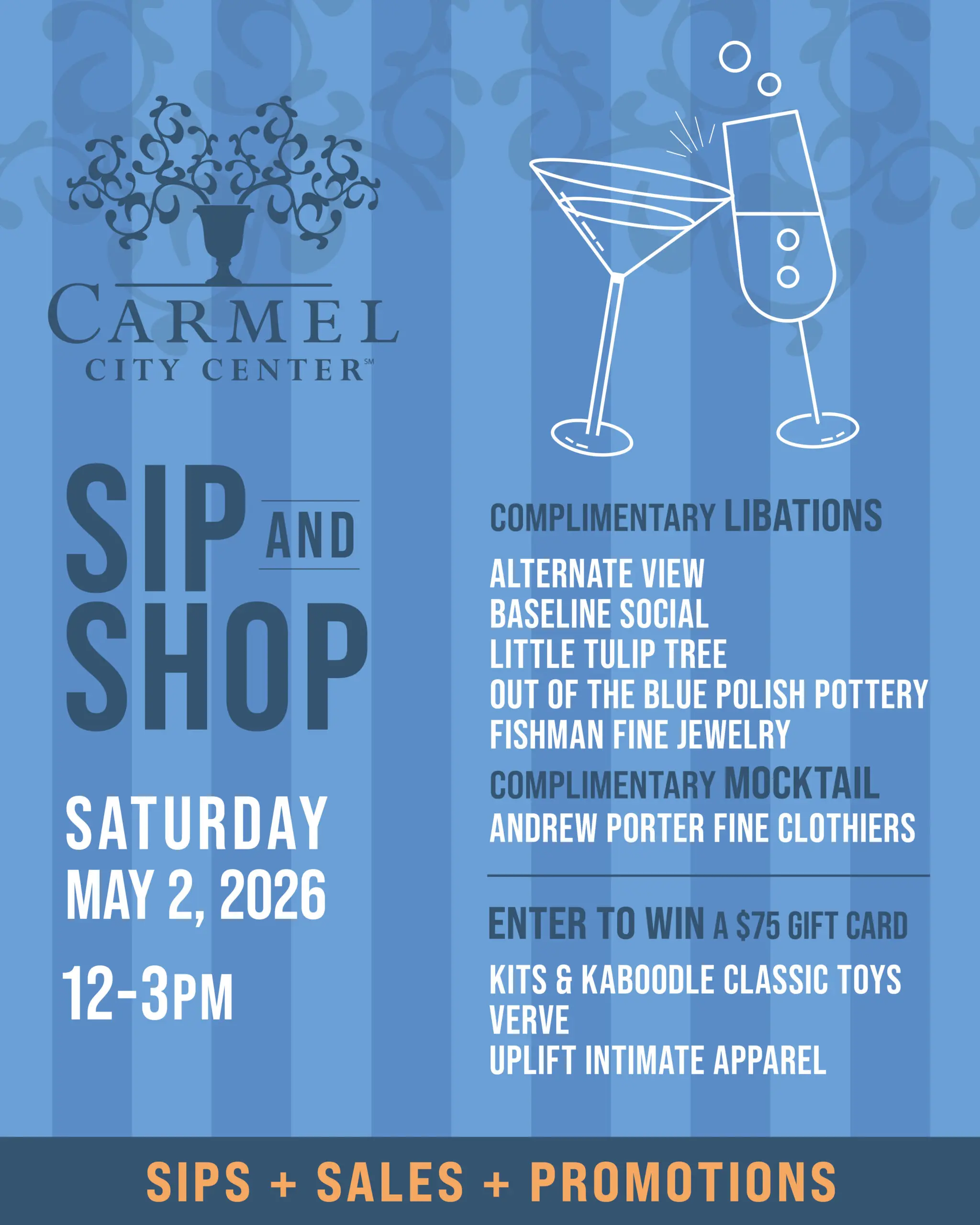 Join us at Carmel City Center on Saturday, May 2 from 12–3 p.m. as we kick off the 2026 Sip & Shop Series with an afternoon of shopping, special sales, and complimentary sips at some of your favorite shops.