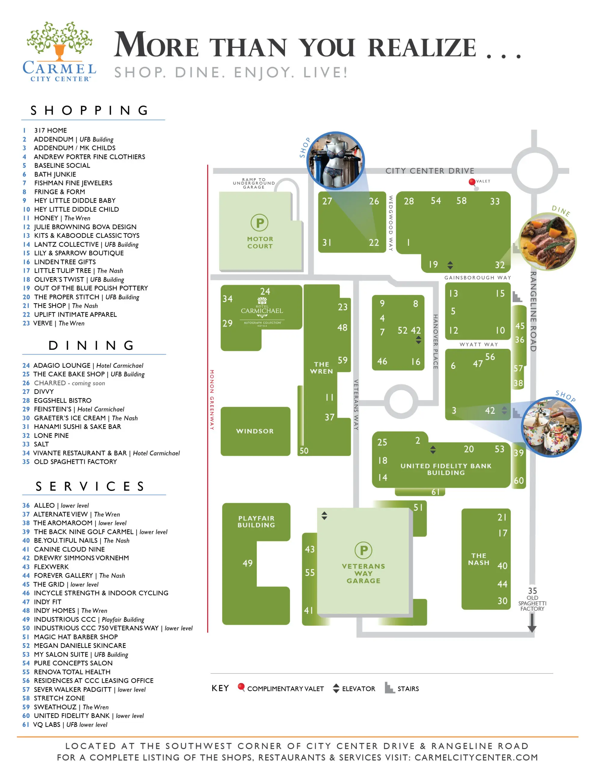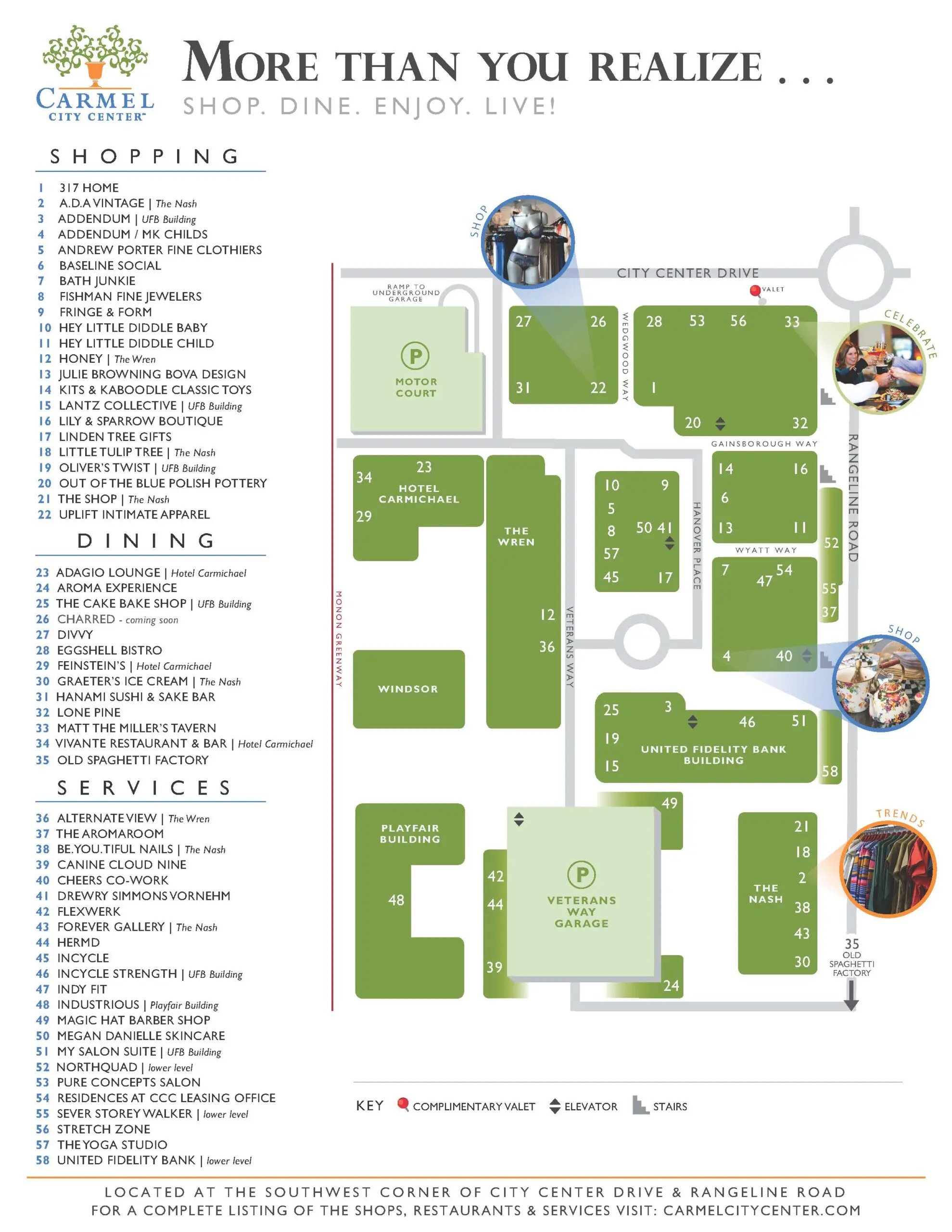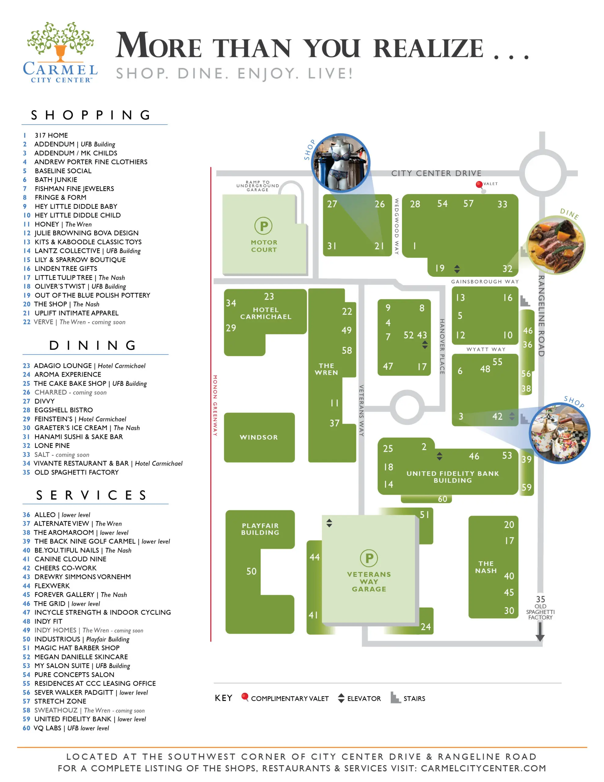 In Carmel City Center, free parking is conveniently located at street level, plaza level and the underground parking garage. Additional parking is located along Veterans Way on the South end of the development.